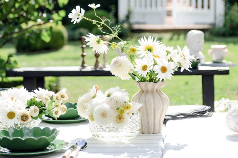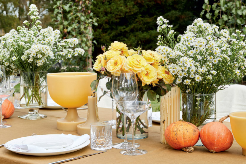 Setting the outdoor table doesn’t mean using melamine plates, plastic cups, and disposable cutlery. You can bring in anything you want. I draw on the look and the feel of the surrounding environment for styling themes. I love to load big ceramic or metal bowls with whatever fruit is in season, lemons, apples, or oranges, or dot terracotta pots of delicate wildflowers or fragrant herbs down the centre of the table. An assortment of vases filled with seasonal flowers works well too. I’m very lucky to have a vegetable patch to source from – I like to use what is directly around me, so in autumn that might mean styling the table with baby pumpkins, and in the summer, trails of jasmine, clematis, or garden roses.