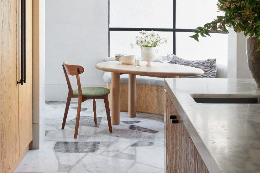 A mix of rounded silhouettes lends this kitchen corner nook a friendly cosiness, with the custom-made table’s solid chubby legs and smooth elliptical top, and the bulbous ceramic and glass vessels on top.