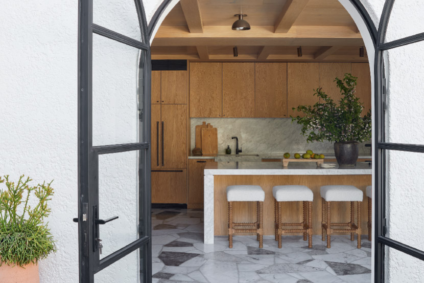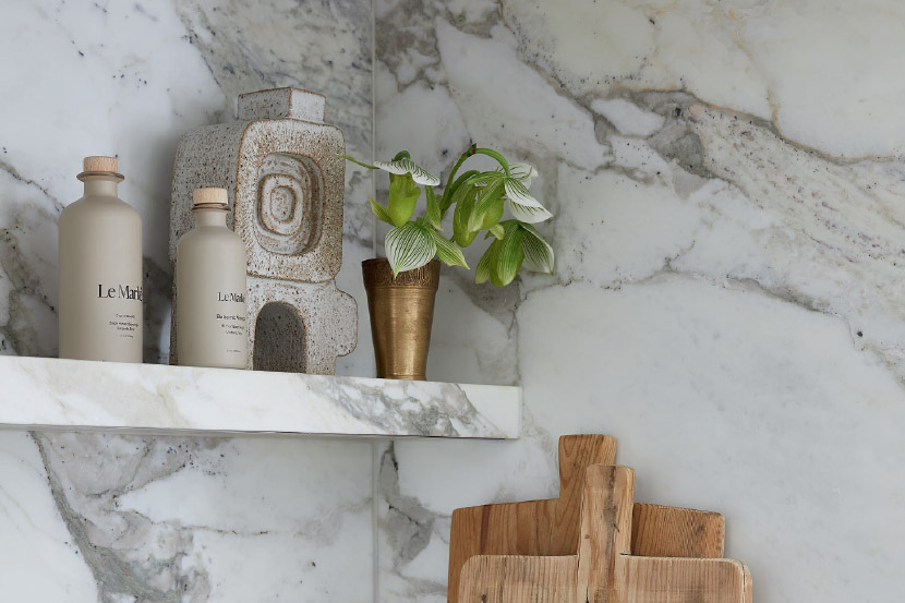 Just as I would style a vignette on a hallway console or coffee table, I do the same on a kitchen bench, grouping together utilitarian, yet sculptural pieces such as hand-thrown ceramics, a sensuous marble oblong bowl, and a stack of vintage Turkish chopping boards.