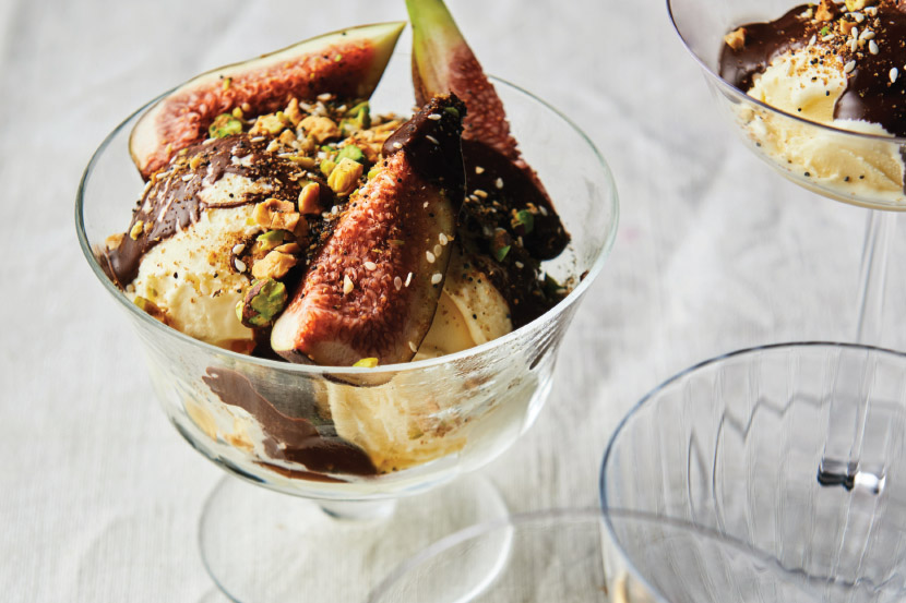 What a delicious way to end a meal: a little bowl of good vanilla ice cream, fresh figs, a nice dolloping of warm chocolate sauce, and a sprinkle of sweet dukkah for crunch and spice.
