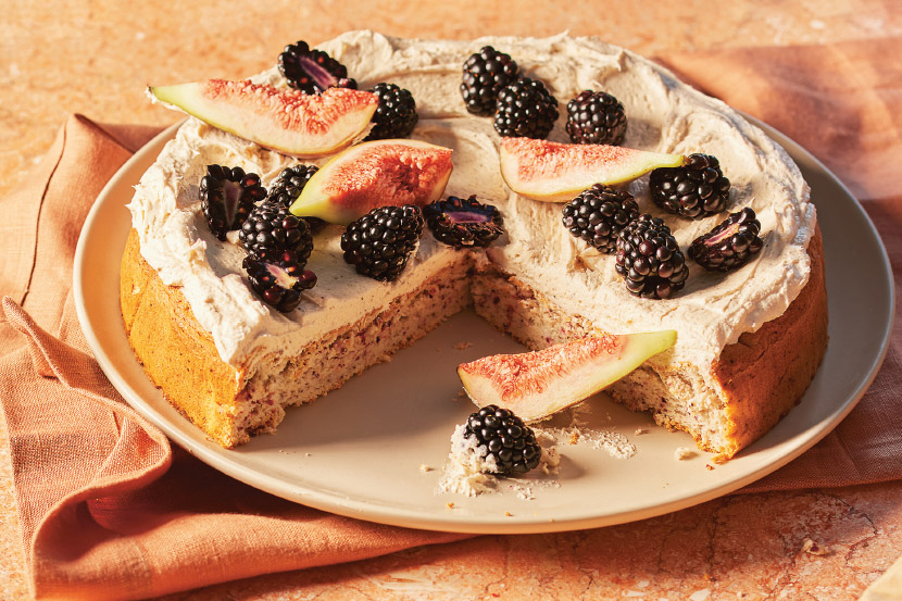 - Cover the cake with the strawberry gum cream frosting, spreading it out with a palette knife but keeping it rough and organic. Decorate with fresh figs and blackberries if you have them.